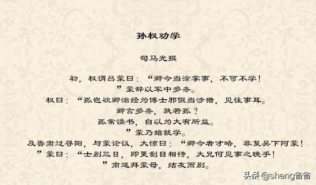 当初,孙权对吕蒙说: "你现在当权掌管政事,不可以不学习!"吕蒙用军中事务繁多的理由来推托。孙权说: "我难道是想要你研究儒家经典成为传授经书的学官吗?只是应当粗略地阅读,了解历史罢了。你说军中事务繁多,谁能比得上我呢?我经常读书, (我)自认为(读书对我)有很大的好处。”吕蒙于是就开始学习。等到鲁肃到寻阳的时候,和吕蒙论议国家大事,(鲁肃)惊讶地说: “你现在的才干和谋略,不再是以前那个吴县的阿蒙了!"吕蒙说: "和有抱负的人分开一段时间后,就要用新的眼光来看待,长兄怎么认清事物这么晚啊!"于是鲁肃拜见吕蒙的母亲,与昌蒙结为朋友才分别。