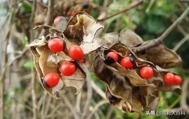 红豆:又名相思子,一种生在江南地区的植物,结出的籽像豌豆而稍扁,呈鲜红色。