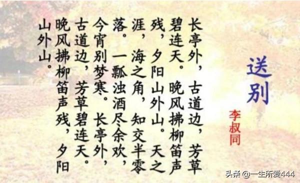 长亭外,古道边,芳草碧连天。问君此去几时来,来时莫徘徊!天之涯,地之角,知交半零落,人生难得是欢聚,唯有别离多。